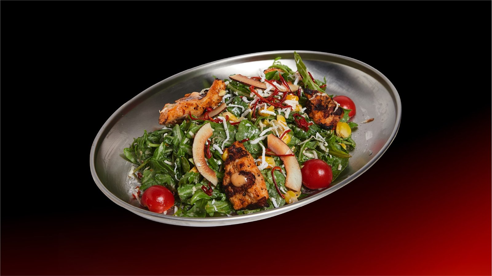 A refreshing salad featuring baby rocca, grilled chicken, sweet corn, crispy coconut, and a luscious sundried tomato Sauce