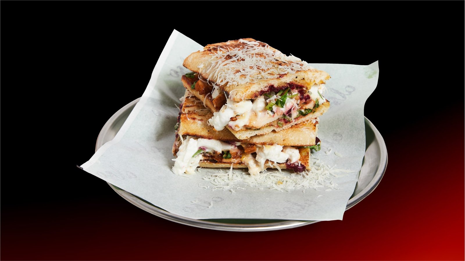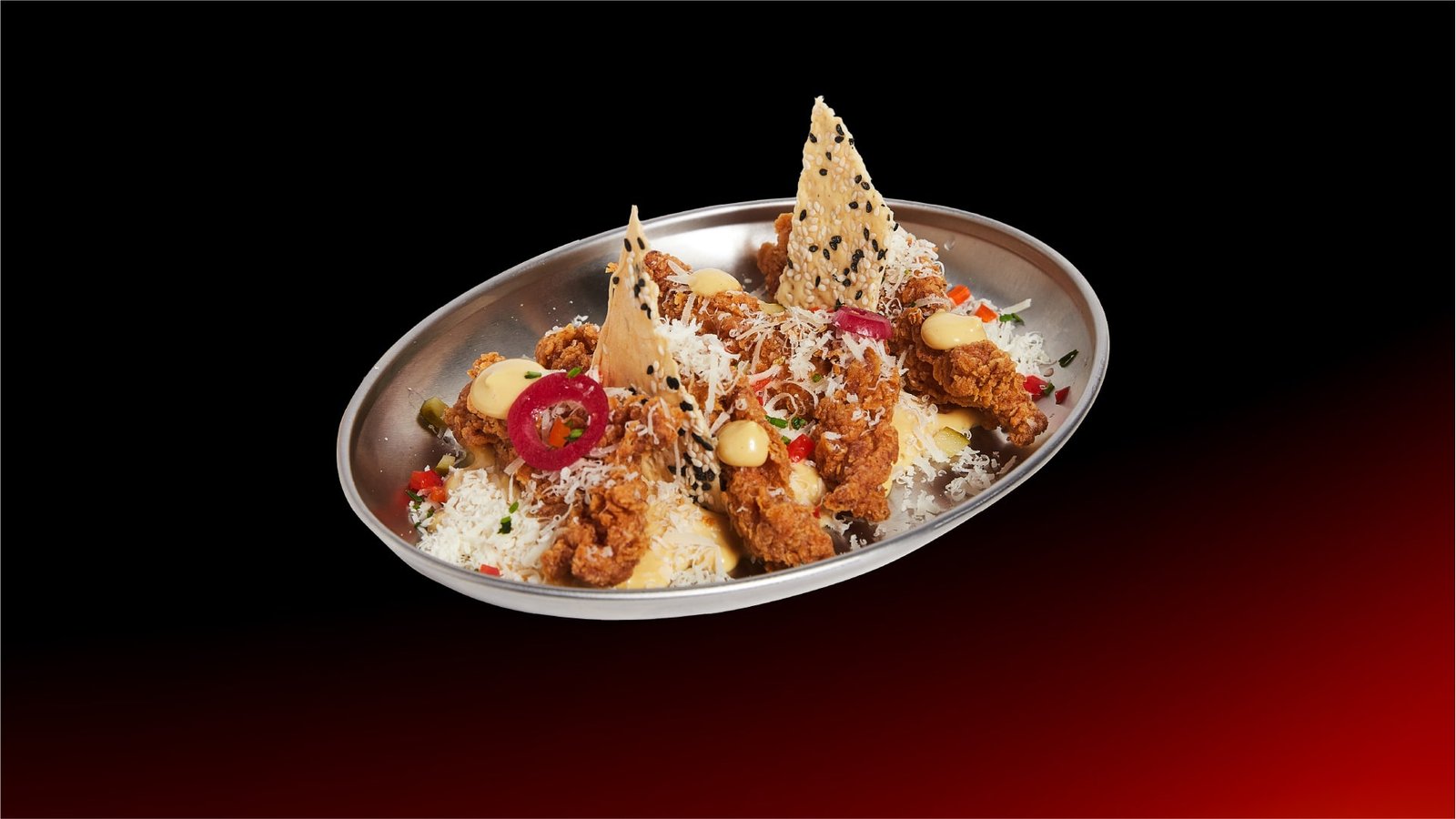 Crispy, tender chicken strips marinated to perfection, served over a bed of creamy chicky sauce, topped with Parmesan Sano and pickled jalapeño for a perfect balance of richness and heat.